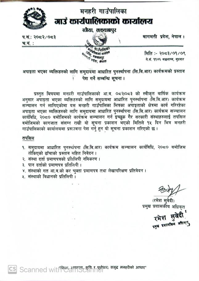 अपाङ्गता भएका व्यक्तिहरुको लागि समुदायमा आधारित पुनसर्थापना (सि.वि.आर ) कार्यक्रमको प्रस्ताव पेश गर्ने सम्बन्धी सूचना ।