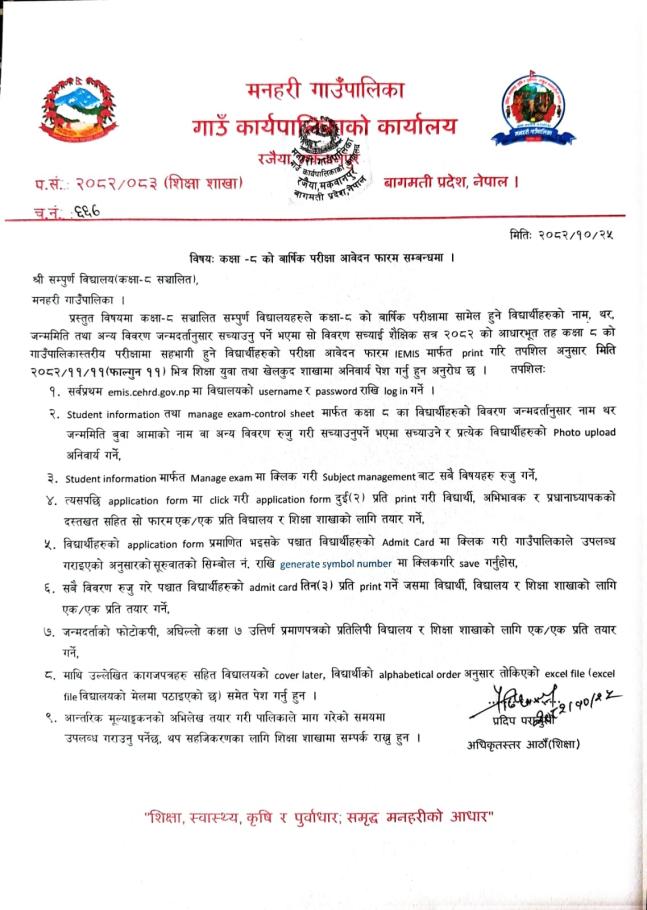 कक्षा ८ को वार्षिक परीक्षा आवेदन फारम सम्बन्धमा