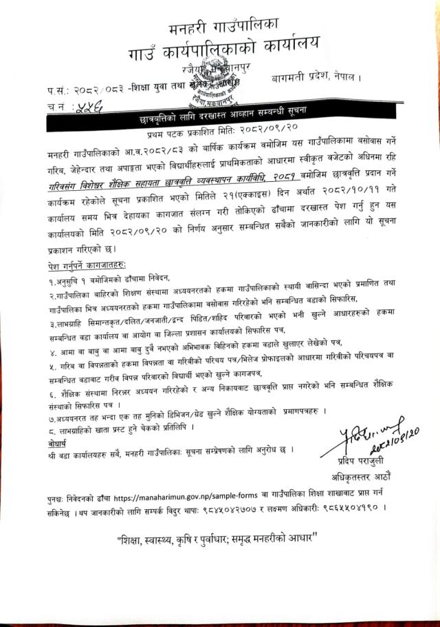 छात्रवृत्तिको लागि दरखास्त आह्वान सम्बन्धी सूचना ।