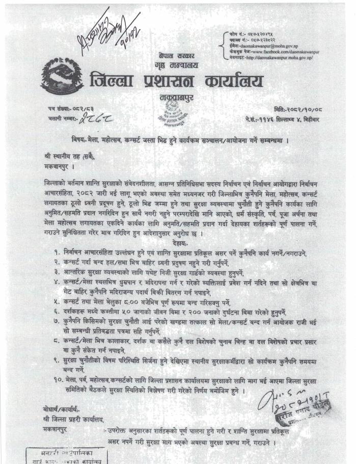 जिल्ला प्रशासन कार्यालय मकवानपुरको मेला, महोत्सव, कन्सर्ट जस्ता भिड हुने कार्यक्रम सञ्चालन/आयोजना गर्ने सम्बन्धमा ।