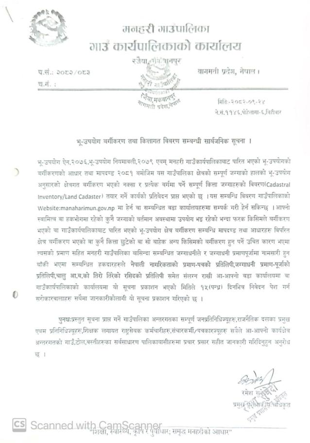 भू-उपयोग बर्गीकरण तथा कित्तागत विवरण सम्बन्धी सार्वजनिक सूचना ।