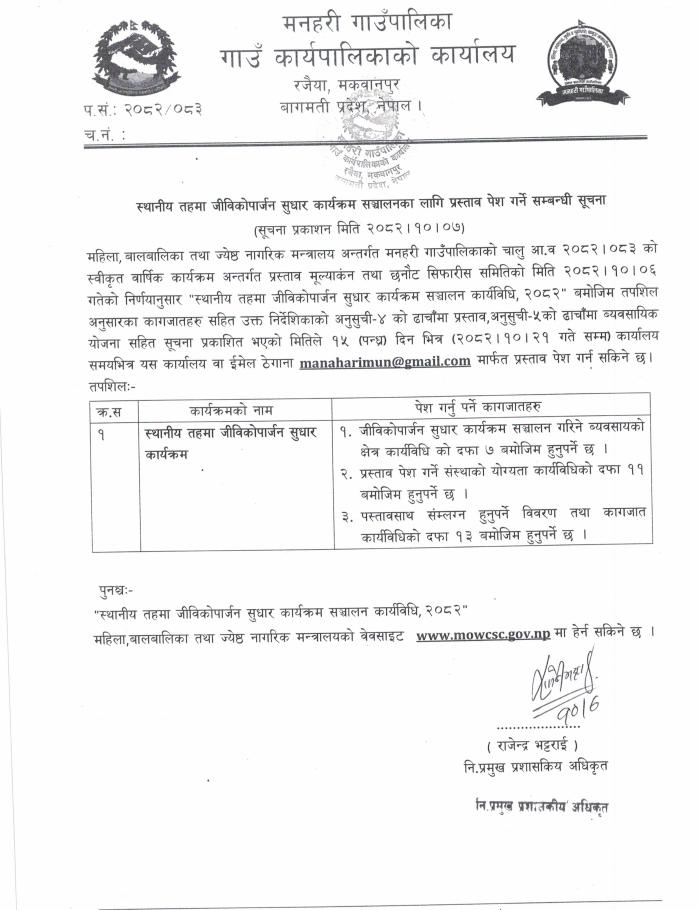 स्थानीय तहमा जिविकोपार्जन सुधार कार्यक्रम संञ्चालनका लागि प्रस्ताव पेश गर्ने सम्बन्धी सूचना ।