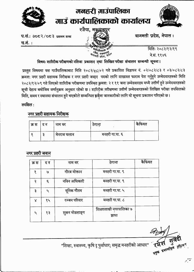 शारिरीक परीक्षणको नतिजा प्रकाशन तथा लिखित परीक्षा संचालन सम्बन्धी सूचना