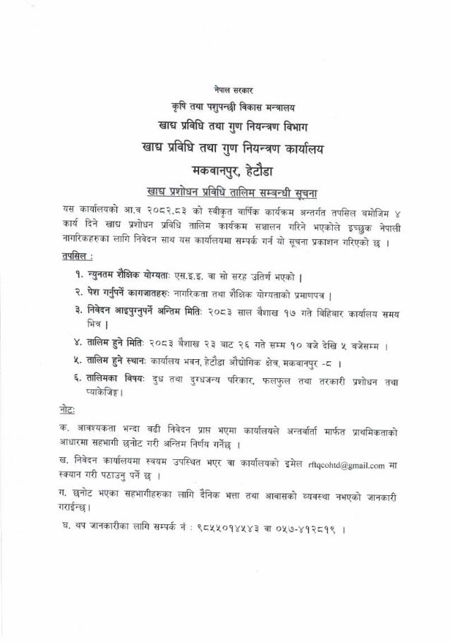खाद्य प्रशोधन प्रविधि तालिम सम्बन्धी सूचना