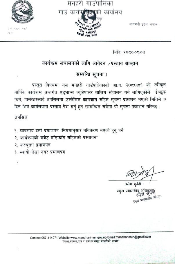 कार्यक्रम संचालनको लागि आवेदन/प्रस्ताव आव्हान सम्बन्धि सूचना ।
