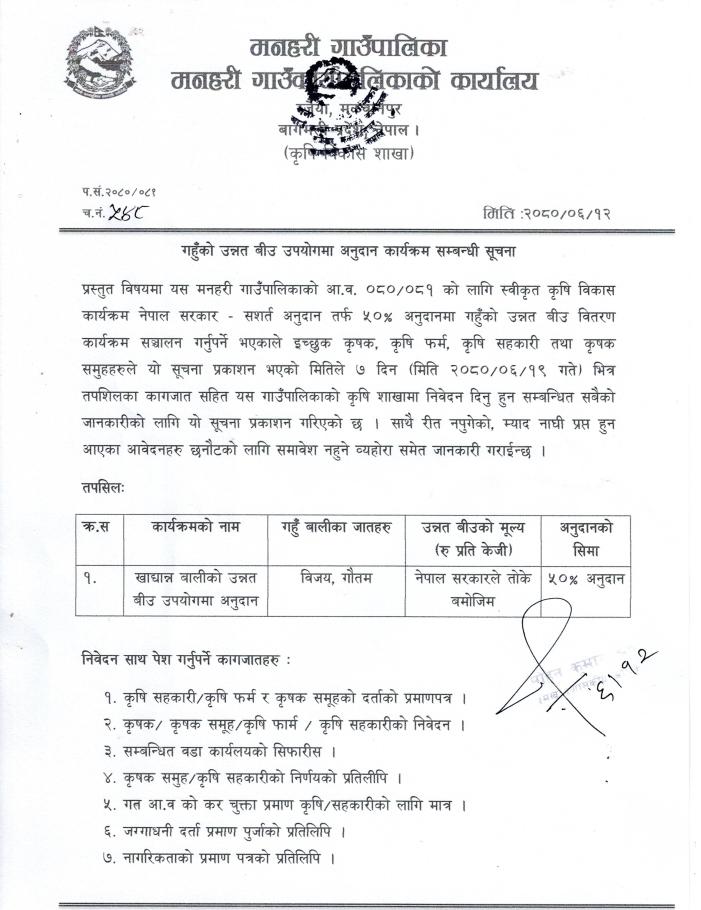 गहुँको उन्नत बीउ उपयोगमा अनुदान कार्यक्रम सम्बन्धी सूचना ।।