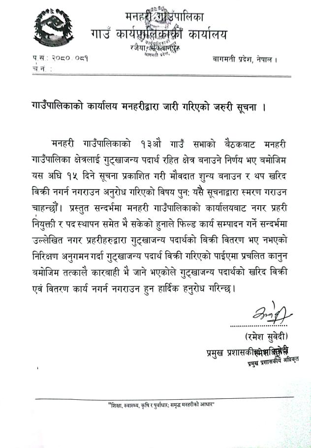 गाउँपालिकाको कार्यालय मनहरीद्वारा जारी गरिएको जरुरी सूचना ।