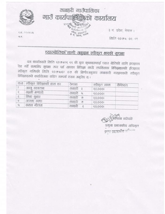 च्याउखेतीको लागि अनुदान स्वीकृत भएको सूचना