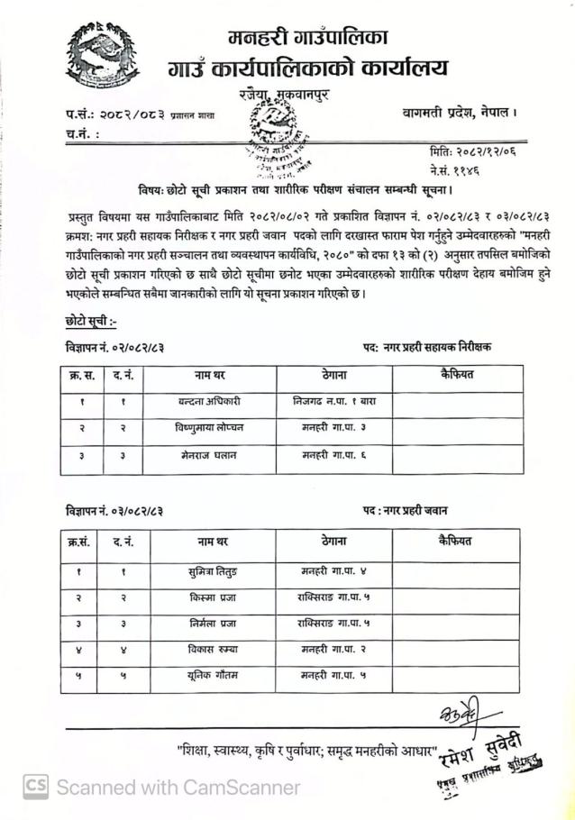 छोटो सूची प्रकाशन तथा शारीरिक परीक्षण संचालन सम्बन्धी सूचना ।