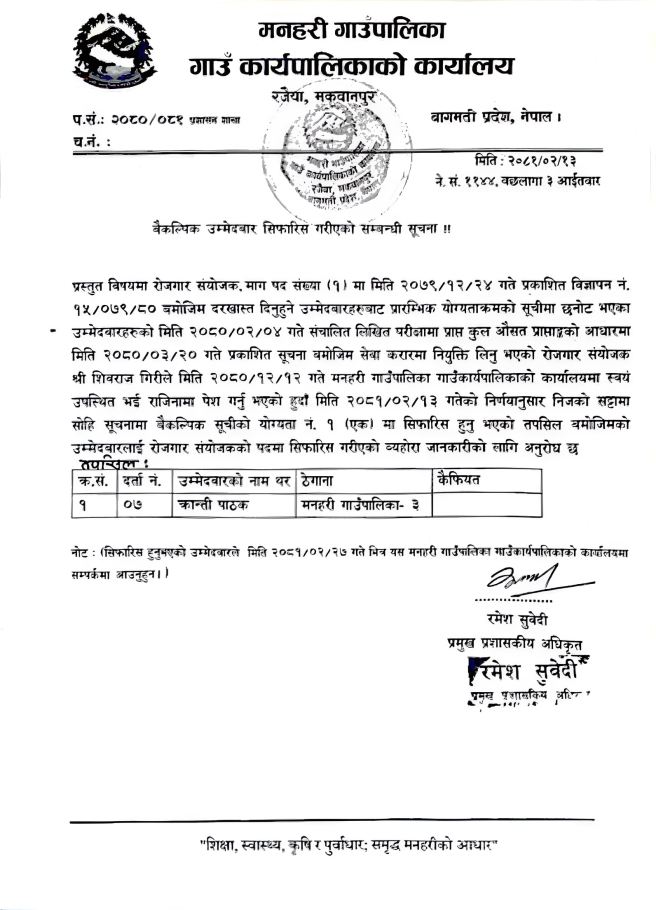 बैकल्पिक उम्मेदवार सिफारिस गरिएको सम्बन्धी सूचना ।