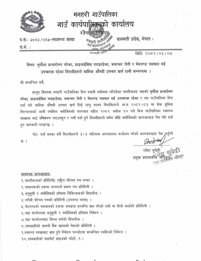 मृगौला प्रत्यारोपण गरेको, डाइलाईसिस गराईरहेको, क्यान्सर रोगी र मेरुदण्ड पक्षघात भई उपचारमा रहेका बिरामीहरुको मासिक ‌औषधी उपचार खर्च दाबी सम्बन्धमा ।
