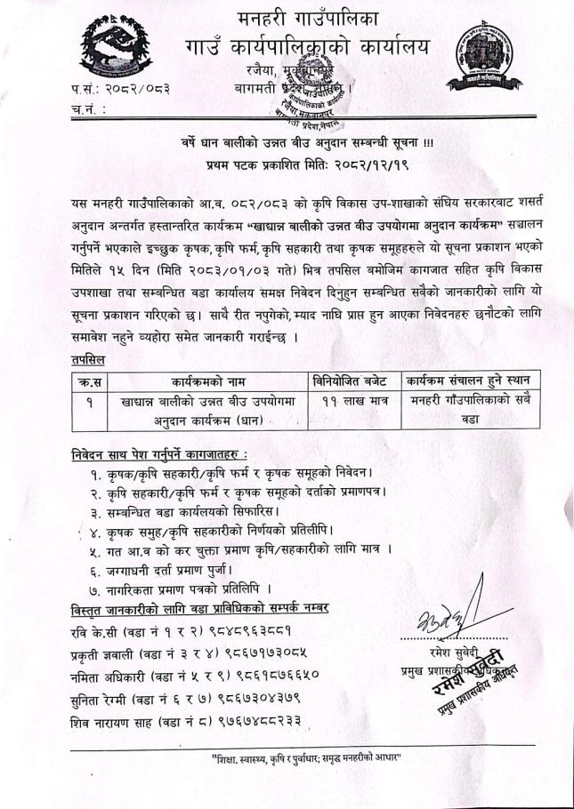 वर्षे धान बालीको उन्नत बीउ अनुदान सम्बन्धी सूचना