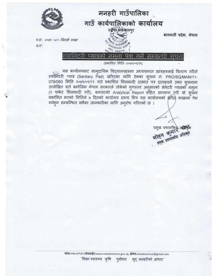 स्यानिटरी प्याड को नमुना पेश गर्ने सम्बन्धमा सूचना ।