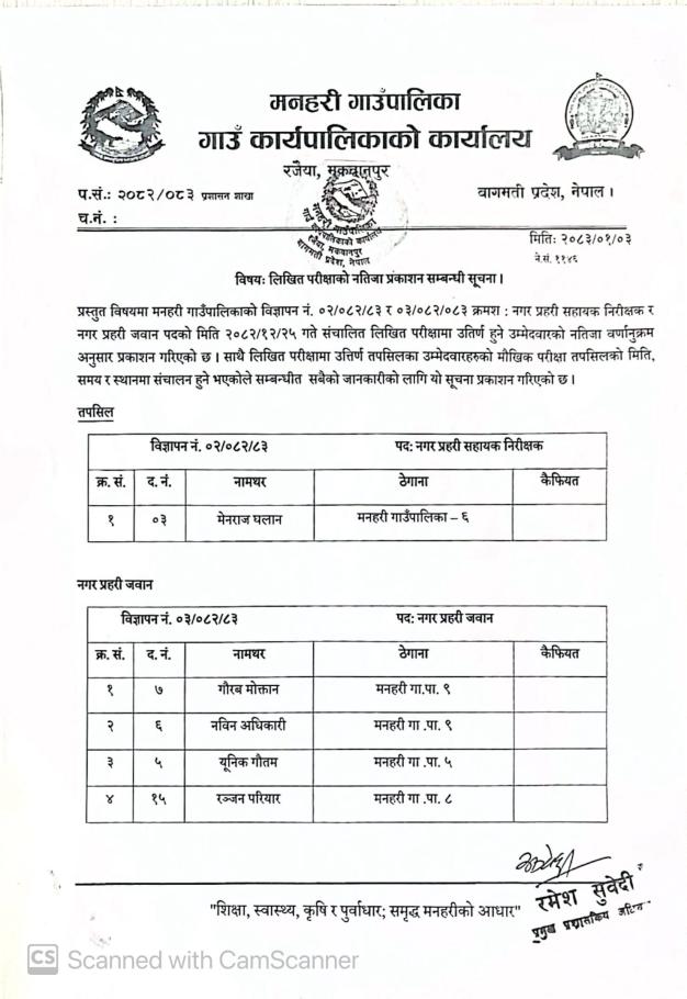 लिखित परीक्षाको नतिजा प्रकाशन सम्बन्धी सूचना ।